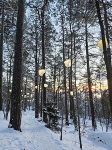 O gün, eksi on dört dereceyi bulan çakır ayaz, şehri masalsı bir beyazlığa bürümüştü. Bir ara karın o yakıcı soğuğunda nefesimizin havada kristalleşeceğini zannettim. Ağaçların arasından süzülen gözekler, başka boyutlara açılan kapılar gibi beliriverdi. Adım attığımız her kar kütlesi, tepemizdeki binlerce ışığın yansımasıyla parlıyor; keskin ayaza inat, sanatın sıcaklığı benliğimizi kuşatıyordu. Bedenimiz üşürken ruhumuzun ısındığı o anlar, zihnimizde bir çelişki olarak yer etti. Şehrin gürültüsünü tepenin eteklerinde bırakıp ormanın derinliklerine doğru tırmanırken bizi neyin beklediğini az çok tahmin ediyorduk ancak Nordic Pixel Forest ile yüz yüze gelmek, tüm beklentilerimizin ötesinde bir deneyimdi. Burası sıradan bir heykel parkından ziyade; doğanın ortasında teknolojinin ruh bulduğu, zamanın askıya alındığı bir rüya koridoruydu.