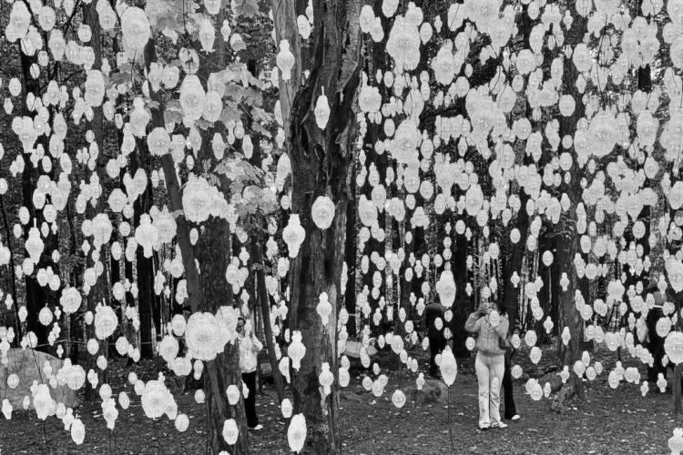 Gözlerimizi yukarı kaldırdığımızda, yedi metre yüksekliğe uzanan görkemli bir ağla karşılaştık. Dört yüz çelik telden örülen düzenek, ormanın derinliklerine nakşedilmiş yapay bir sinir sistemi gibiydi. 24.000 LED ışıkla oluşturulan 3600 piksel, ziyaretçilerin video görüntülerinin içinden fiziksel olarak geçmelerine olanak sağlıyor. Uzaktan bakıldığında karların üzerine yağan rengarenk bir yağmuru ya da parçalanarak özgürleşmiş uçsuz bucaksız bir ekranı andıran bu illüzyon, izleyiciyi sanatın bir parçası haline getiriyor.