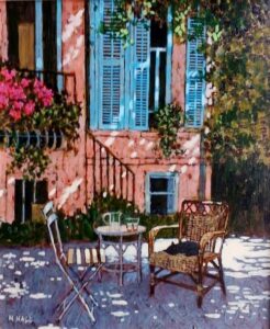 Geçenlerde, Mike Hall isimli bir İngiliz ressamın tablosuna rastladım. Arka planda mavi panjurlu, yavruağzı boyalı müstakil bir ev duruyordu. Bahçeden balkona çıkan merdivenler, pembe taç yapraklı çiçekler, balkonun aralık kapısı, evin yanı başındaki ağacın -sanki salınan- yemyeşil yaprakları…